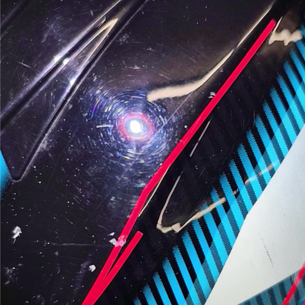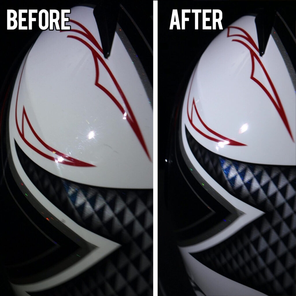 線傷がヘルメット全体にあり、研磨は初期、中間、仕上げの3工程で対応。